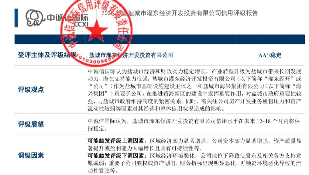 12月31日,集團(tuán)子公司鹽城市灌東經(jīng)濟(jì)開發(fā)有限公司獲得國內(nèi)權(quán)威信用評(píng)級(jí)機(jī)構(gòu)—中誠信國際授予的AA+主體信用評(píng)級(jí),評(píng)級(jí)展望為“穩(wěn)定”。2026-01-01 -